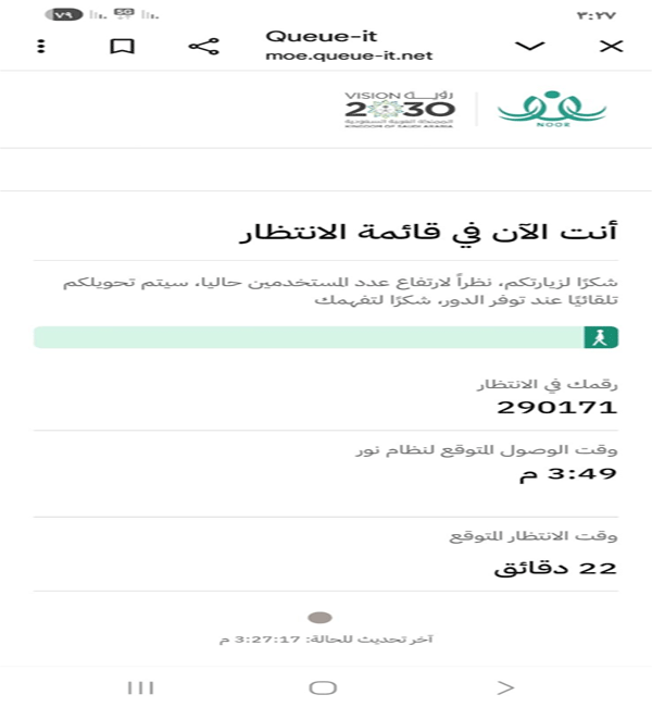 أعادت بوابة نور اليوم الخميس 2026/01/08 م أولياء الأمور إلى ذاكرة "قائمة الإنتظار" جداء ذلك بعد أن أخفق نظام «نور» التابع لوزارة التعليم في استيعاب الضغط الكبير المصاحب لإعلان نتائج الاختبارات النهائية للفصل الدراسي الأول من العام الدراسي 1447، ليجد أولياء الأمور أنفسهم مجدداً أمام رسالة مألوفة: «أنت الآن في قائمة الانتظار».